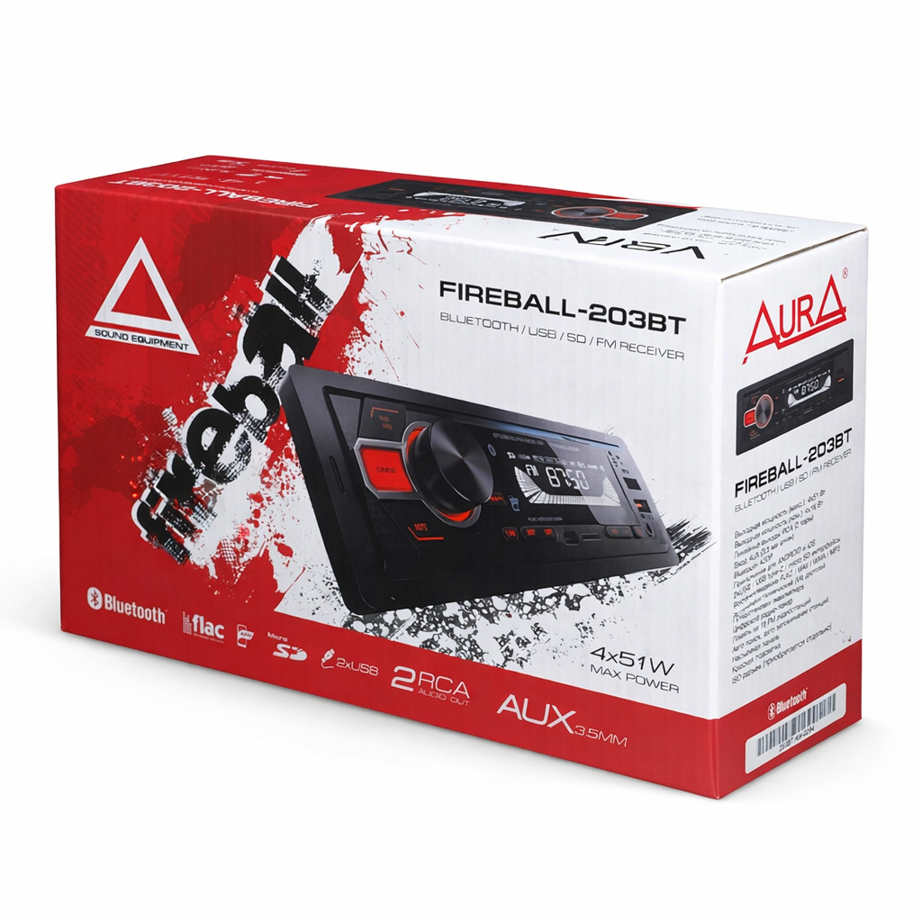 AURA FIREBALL‑203BT — это компактный мультимедийный автомобильный ресивер формата 1DIN, который объединяет FM‑радио, Bluetooth (A2DP), USB и SD‑интерфейсы, а также AUX‑вход. Поддерживаются популярные аудиоформаты (FLAC, MP3, WAV, APE, AAC). Устройство оснащено 2 парами линейных выходов RCA, цифровым тюнером с памятью на 18 радиостанций и яркой красной подсветкой, обеспечивая базовый уровень мультимедиа в автомобиле.