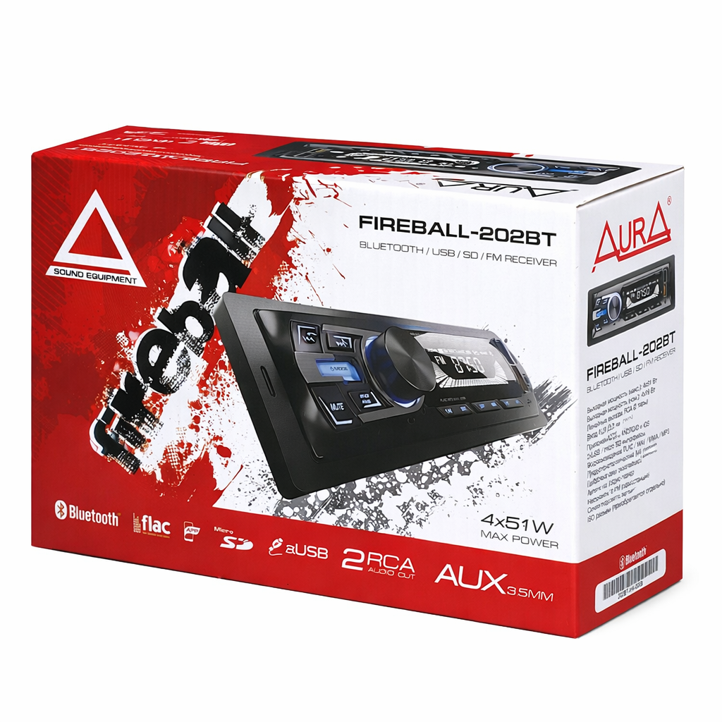 AurA FIREBALL-202BT — автомобильный мультимедийный ресивер формата 1DIN с поддержкой Bluetooth, USB-накопителей и microSD-карт. Модель предназначена для воспроизведения музыки с разных источников и подключения смартфона для беспроводной передачи аудио. Устройство оснащено встроенным усилителем, FM-радио и линейными выходами RCA для подключения внешних усилителей, что позволяет использовать его как основу автомобильной аудиосистемы.