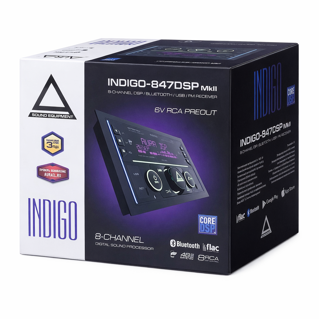 AURA INDIGO-847DSP MKII — процессорная автомагнитола формата 2DIN с встроенным DSP и поддержкой Bluetooth. Позволяет воспроизводить аудио с USB и смартфонов, а также гибко настраивать звук благодаря 48-полосному эквалайзеру и поканальной коррекции. Подходит для построения продвинутой аудиосистемы с внешними усилителями.
